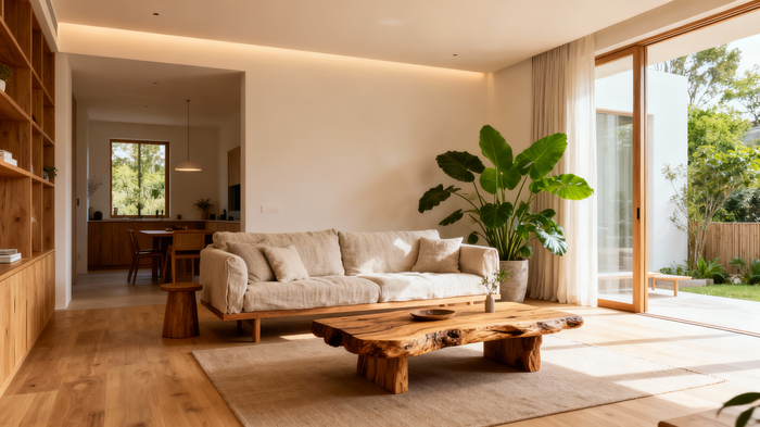Мебель с плавными формами, столики со спилом натурального дерева, ротанговые кресла-качели, текстиль в натуральных оттенках — все это работает вместе, чтобы создать ощущение гармонии. Посмотрите, как красиво смотрится деревянная столешница со своей естественной текстурой, с неровностями — это же не дефект, это красота. Это то, чего не может дать искусственный материал.