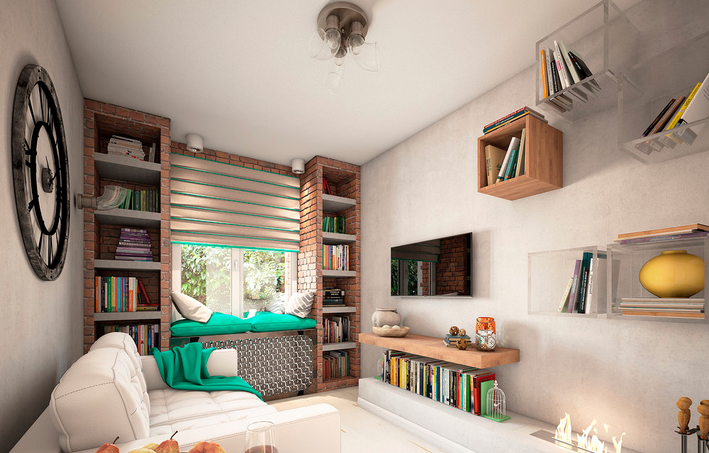Минимализм – это прежде всего простые незамысловатые формы; это интерьер, собранный из едва ли не примитивных вещей. Однако собран он должен быть со вкусом и смекалкой, иначе «тыква не превратится в карету». Вот неплохой пример, когда уют уголка вокруг окна держится на простейших геометрических фигурах, а ведь такой диванчик и полочки при желании можно соорудить самому.