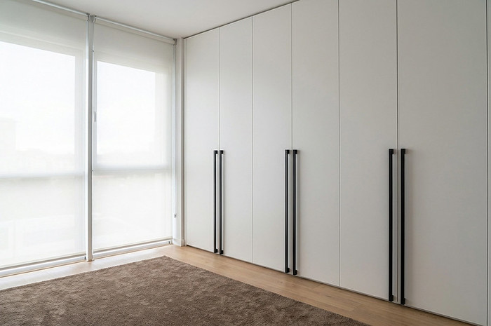 Кроме того, распашные двери позволяют использовать любые материалы: от ЛДСП и МДФ до эмали, массива дерева или стекла. Это даёт свободу в выборе цвета и текстуры — например, матовый белый фасад в тон стене или глубокий чёрный в стиле лофт. Главное — единообразие. Один или два больших полотна выглядят строже и уравновешеннее, чем три-четыре узкие двери купе.
